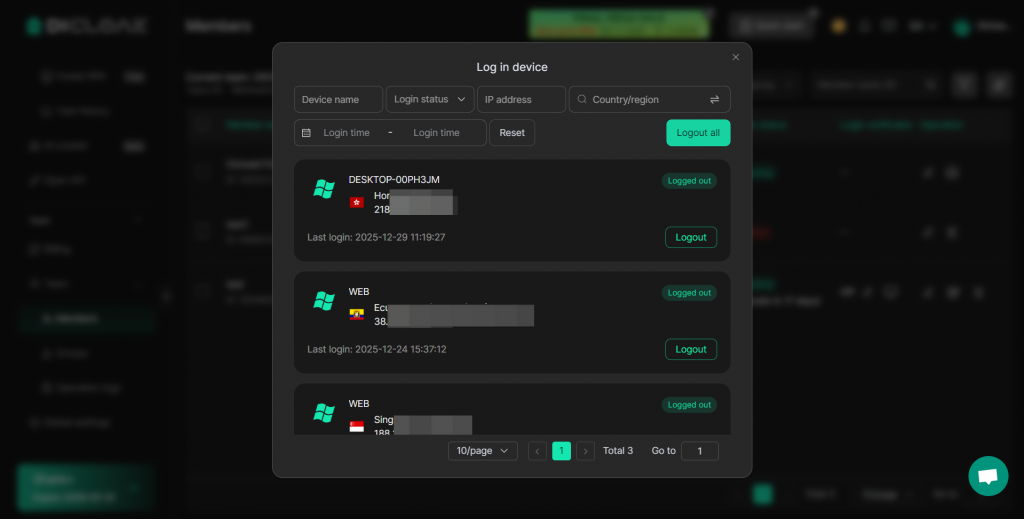 Go to [Team] > [Members], click the “Device” icon to view the devices that have logged into the member’s account, and log out suspicious devices.