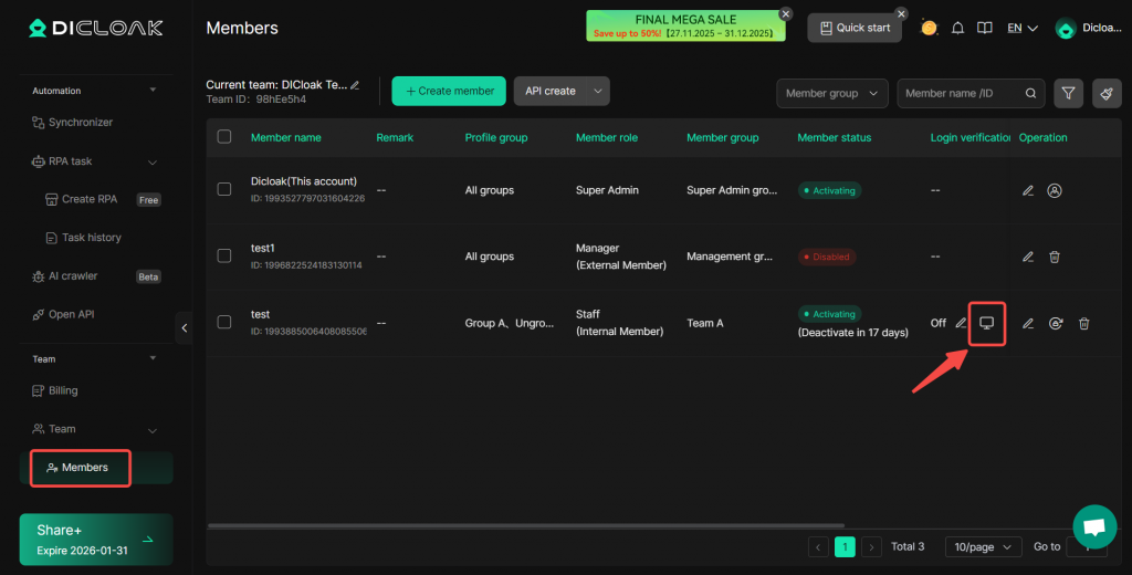 Enable 2FA (Two-Factor Authentication) for member’s DICloak accounts. When logging in, members will need to obtain a verification code from the administrator to prevent them from sharing the account with others. Here’s how to set it up: Important Note: Currently, 2FA is only supported by internal members. If you use 2FA Verification, your members will need to contact the team admin for the 2FA verification code when logging in from new devices.This feature can prevent members from sharing login account information at will.