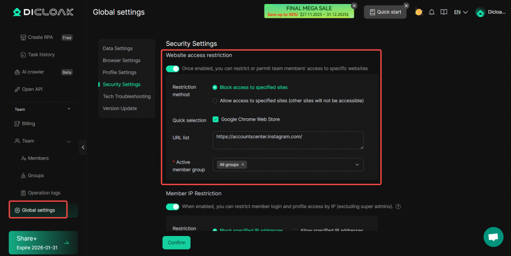 Go to [Global Settings](Or customize settings for a specific profile), enable [Website access restriction] under [Security Settings], and add the URLs of platform account management pages or other privacy‑sensitive webpages to the URL list.