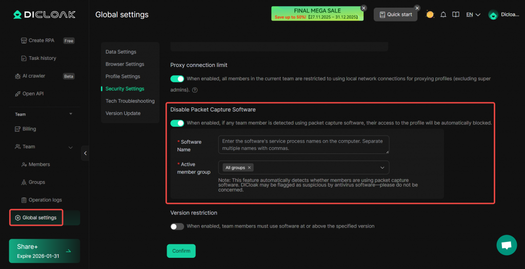 Navigate to [Global Settings] > [Disable Packet Capture Software]. You can add the names of common packet capture tools (as they appear in Task Manager) to the software list to prevent members from using such tools to steal platform account information.