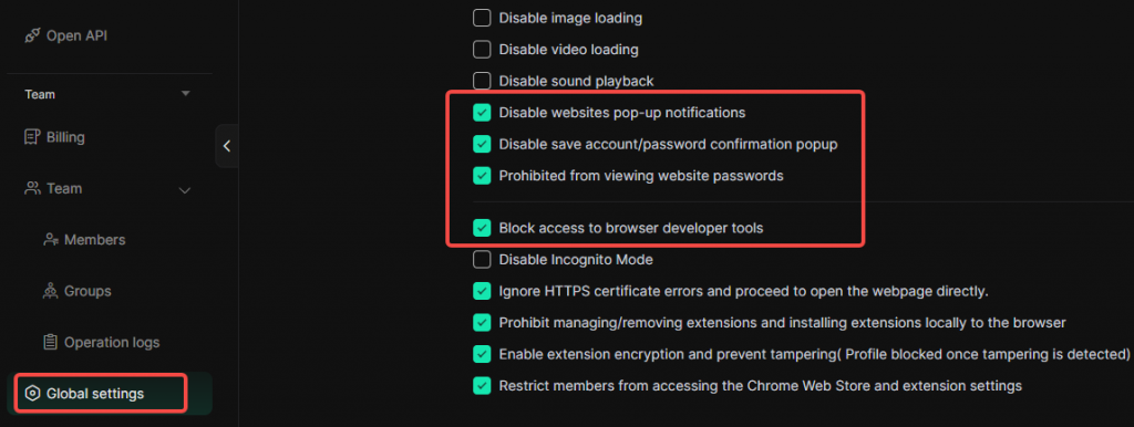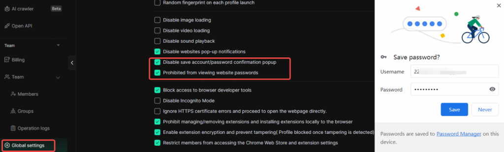 - Enable Disable websites pop-up notifications and Disable save account/password confirmation popup feature, so members will not be able to view, modify, or copy account passwords, nor will they have access to the password manager.