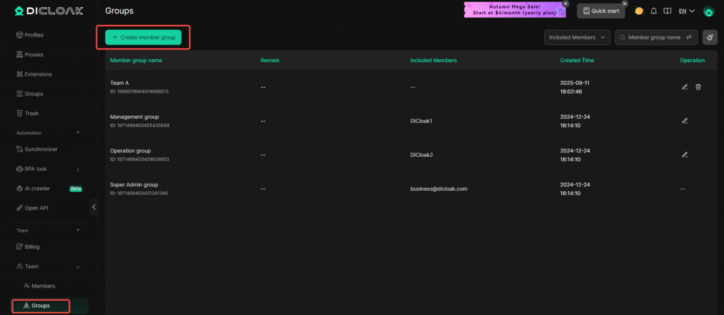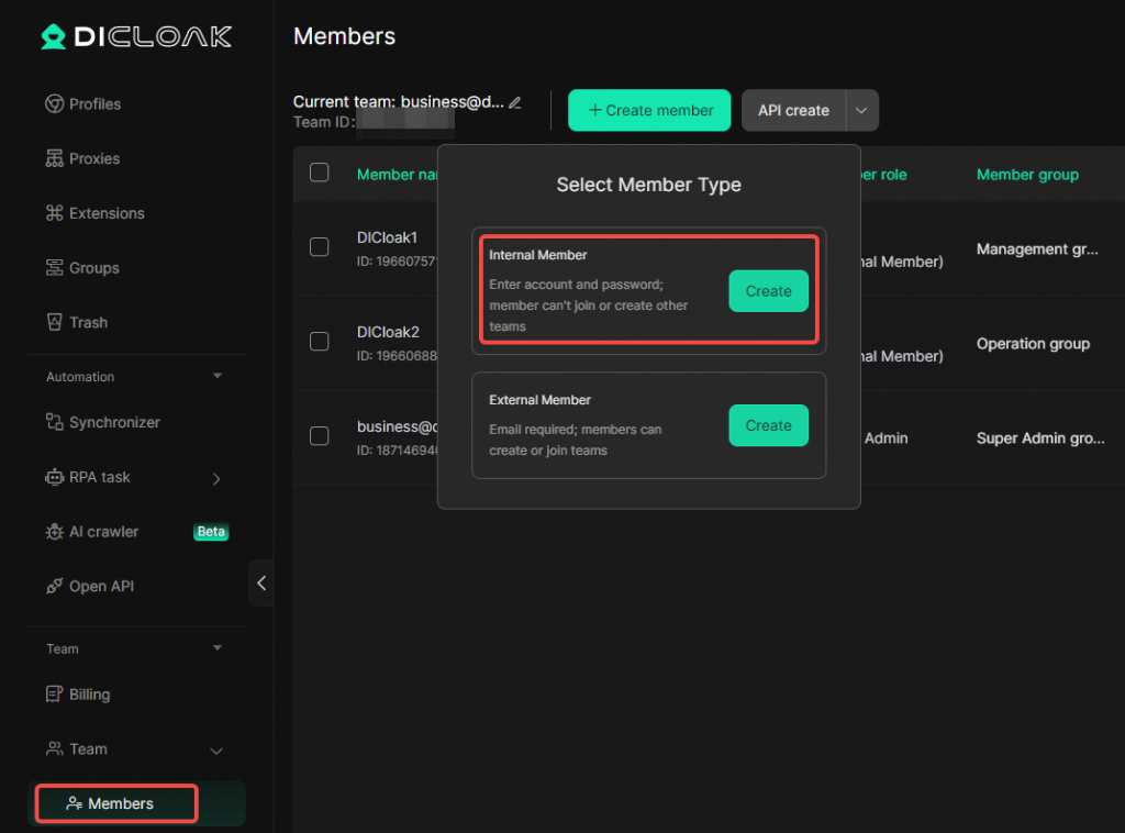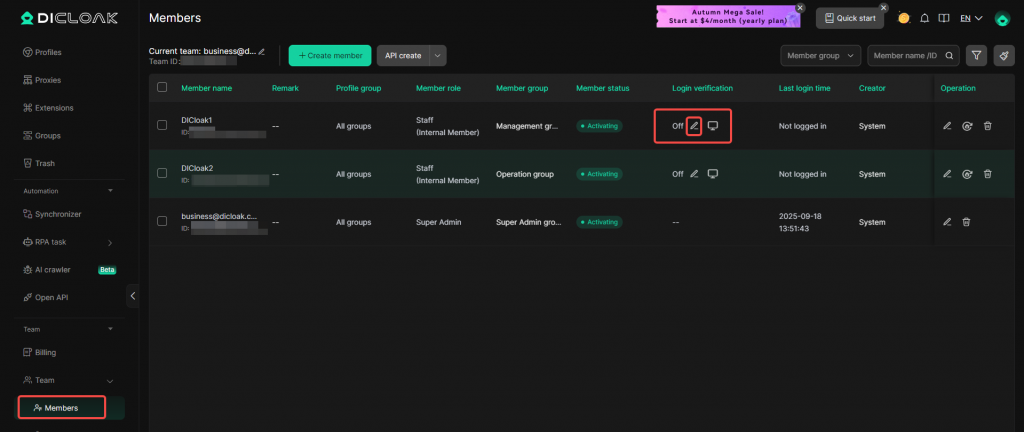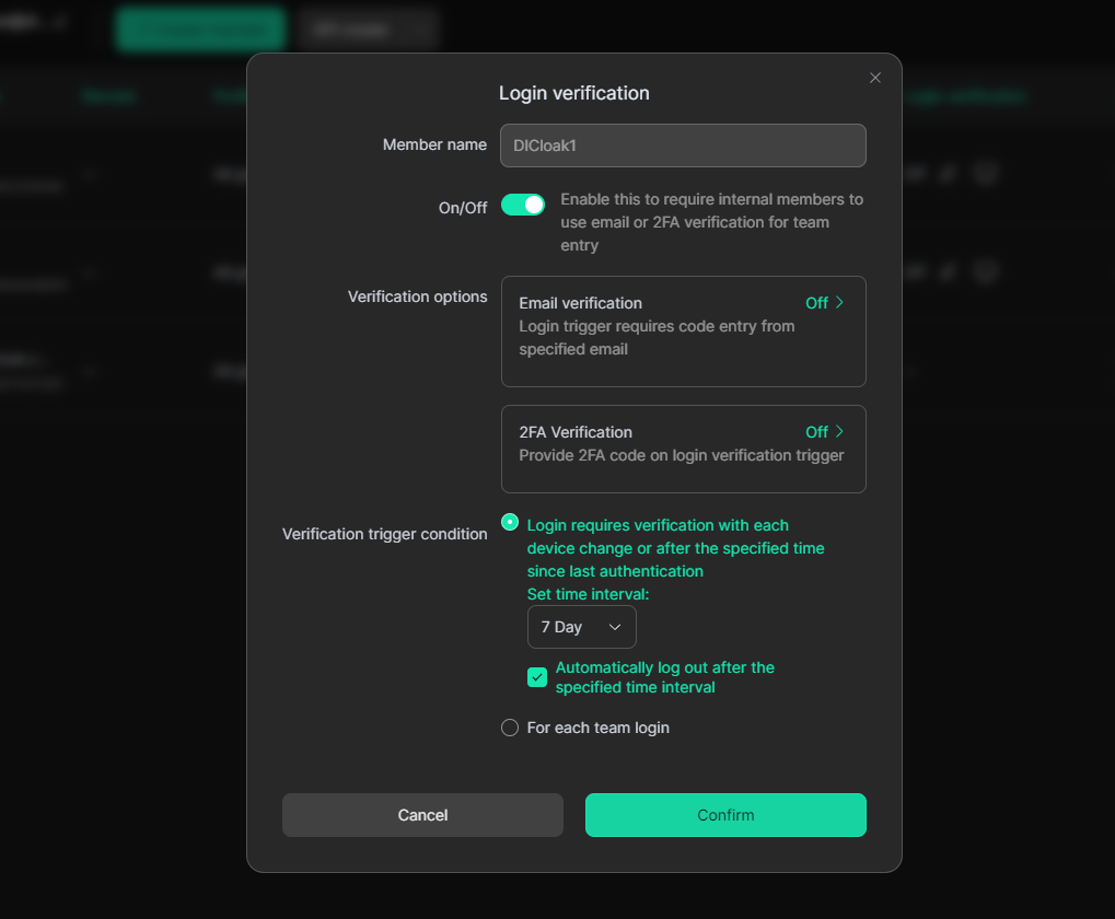 Enable 2FA (Two-Factor Authentication) for member’s DICloak accounts. When logging in, members will need to obtain a verification code from the administrator to prevent them from sharing the account with others. Here’s how to set it up: Important Note: Currently, 2FA is only supported by internal members. If you use 2FA Verification, your members will need to contact the team admin for the 2FA verification code when logging in from new devices.This feature can prevent members from sharing login account information at will.