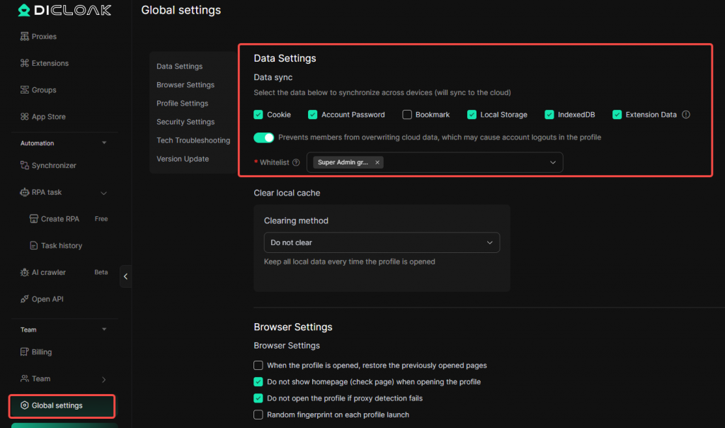 - Global Settings: Go to Global Settings and enable the data sync function. This setting will apply to all browser profiles.