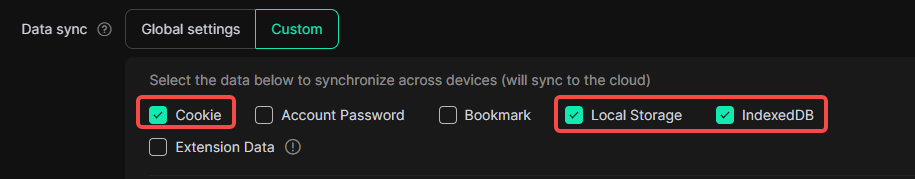 - Enable synchronization for Cookies, Local Storage, and IndexDB. These three data types are key to saving tool account login states. Once enabled, members can access the logged-in account information when opening the browser profile.