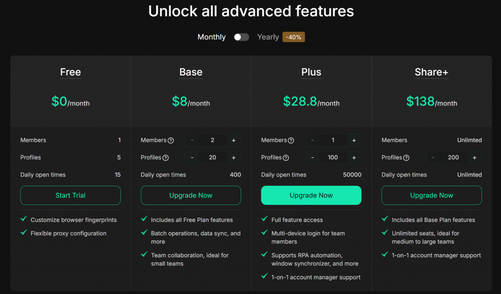 - Base plan price:$138.00/month (includes unlimited members and 200 browser profiles)