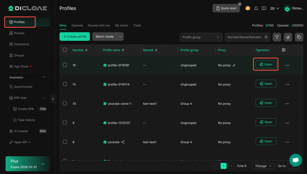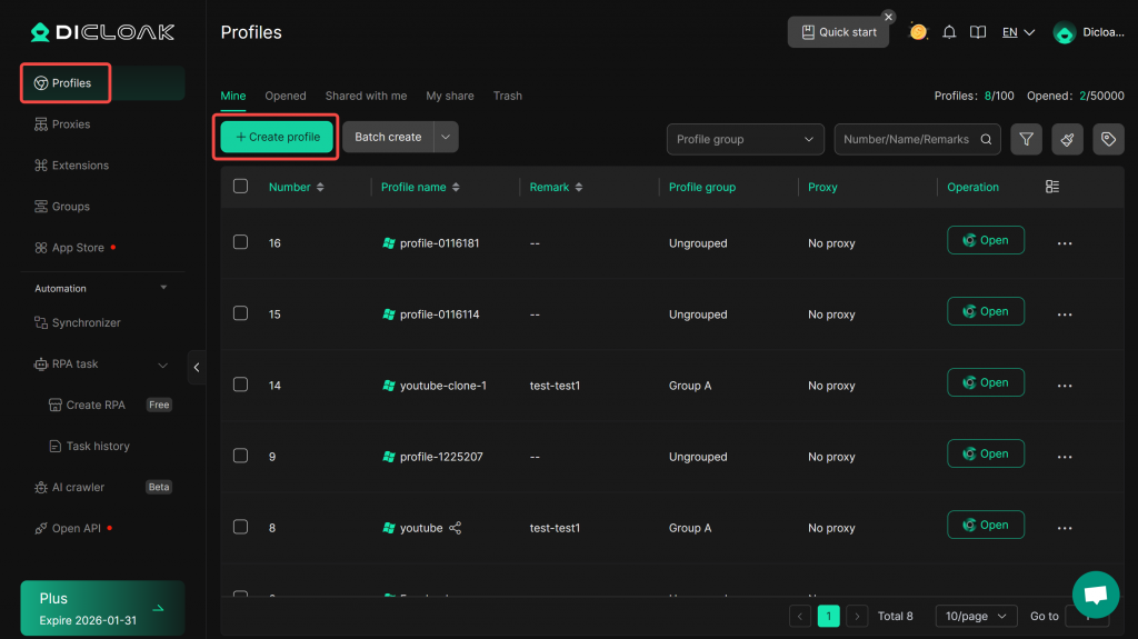 - After logging into DICloak Antidetect Browser, create new browser profiles.