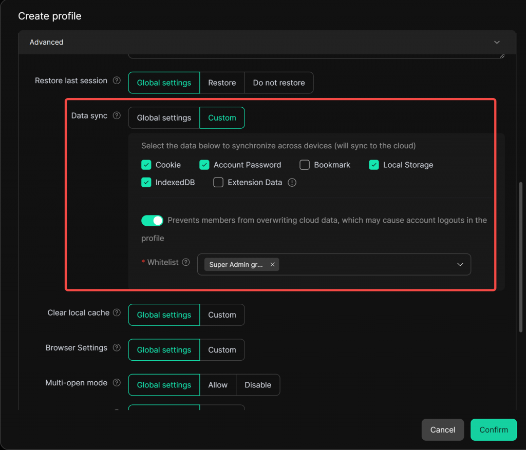 - Enable Data sync, and at least select cookies, local storage, and indexedDB. You can also configure these settings in the [Global Settings].