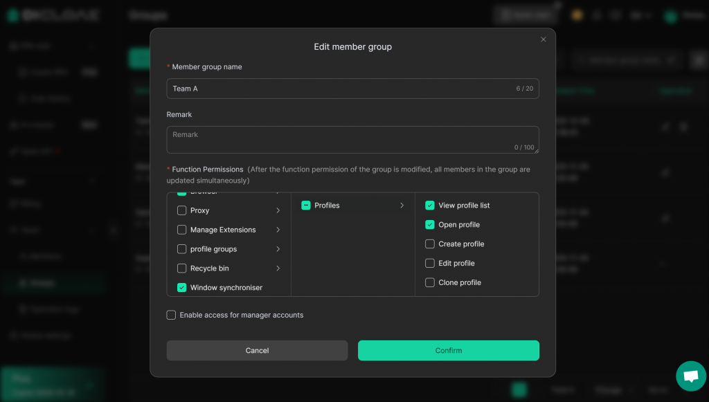 - Assign team groups and set function permissions to ensure that each member only accesses authorized accounts.
