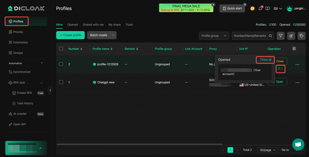 - Opened: 0/50000: It shows the number of times browser profiles that you can open today and the number of times browser profiles that you have already opened today. (PS: You can refresh the list or reopen the DICloak to update the statistics.)