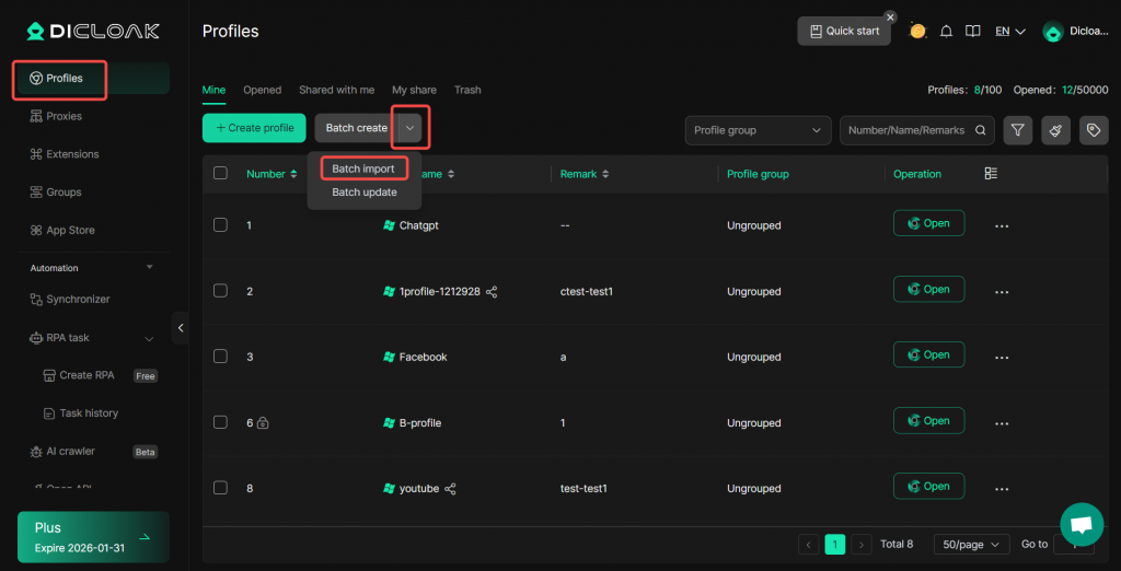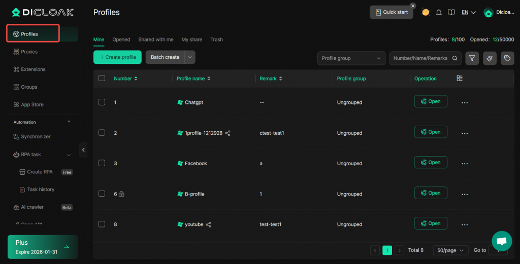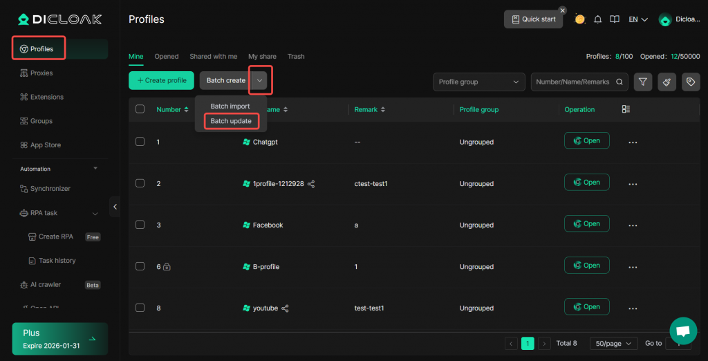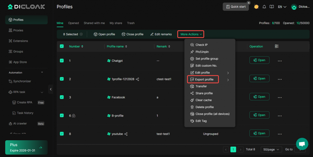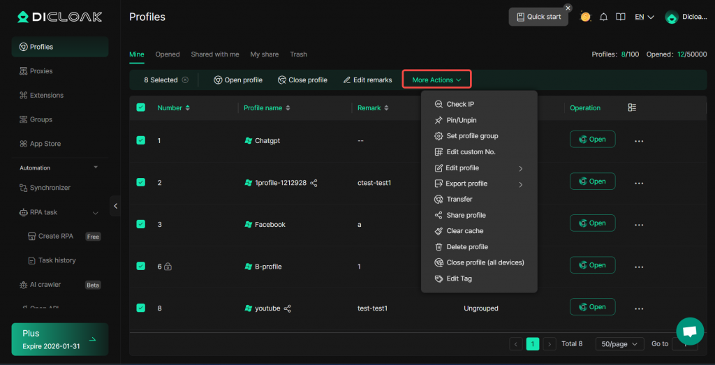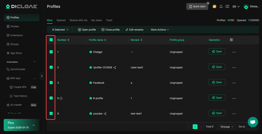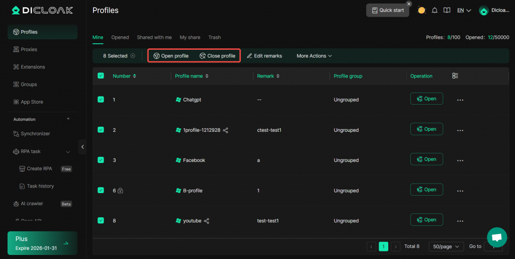 DICloak enables users to perform bulk operations such as opening, closing, transferring, and deleting browser profiles,etc. To access these bulk operations, you need to upgrade your subscription from the Free Plan to paid plans.