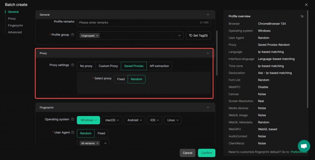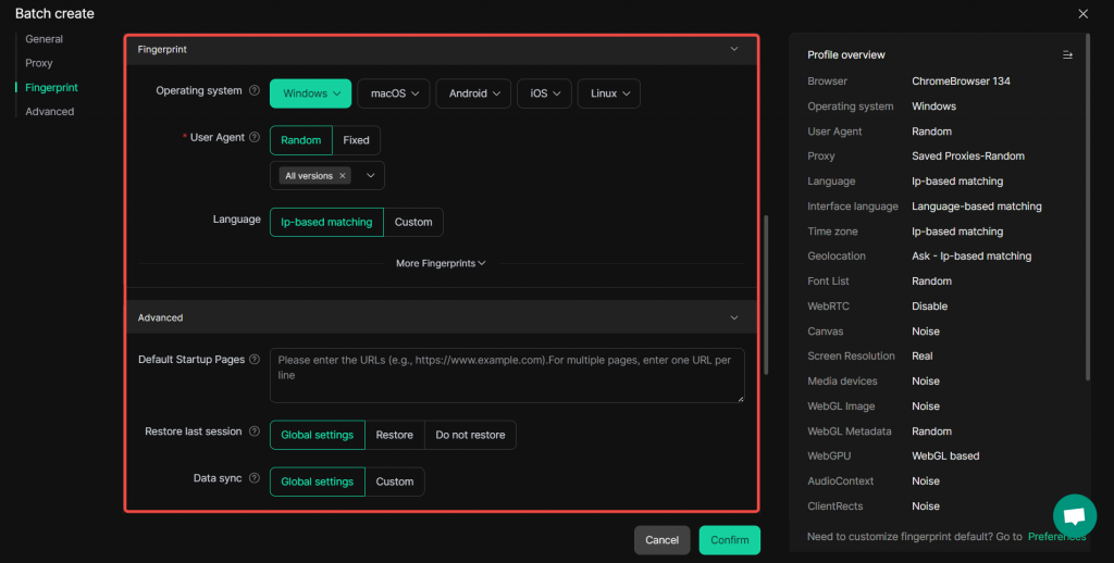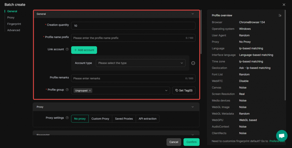 All profiles created in this batch will share the same fingerprint settings and advanced settings.