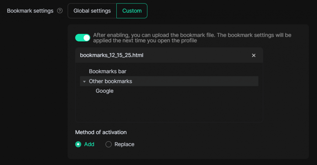 - Upload the exported bookmark file in the Bookmark Settings section. The bookmark folders and included bookmarks will be displayed.