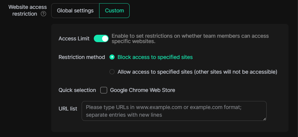 - Access Limit: Enable to set restrictions on whether team members can access specific websites.