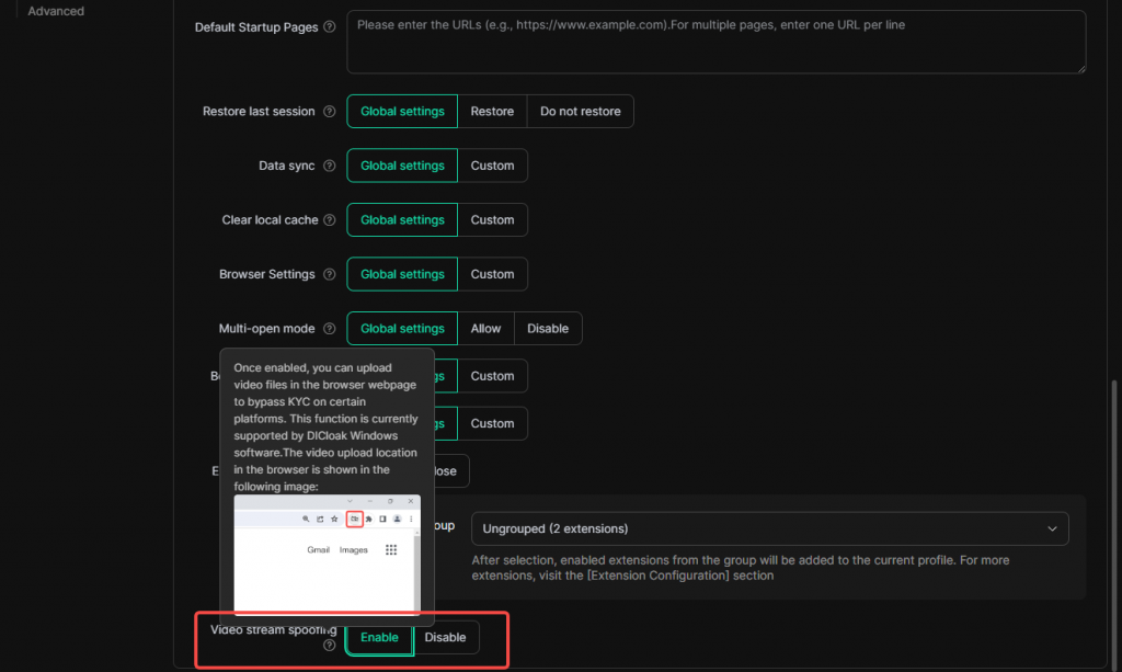 Creating a new browser Profile in DICloak requires advanced settings for the browser Profile, which can comprehensively and precisely control the simulated browser Profile. “Default Startup Pages” facilitates quick access to the target page; “Data Sync” ensures data consistency and facilitates multi-device collaboration; “Clear local cache” allows Custom of whether to clear local data before opening the Profile each time; “Browser Settings” means that when opening the Profile, the browser Profile will take effect according to the selected settings; “Multi-Open Profile” allows multiple members to open the current Profile simultaneously; “Extension Configuration” can add functional plugins, and when opening the Profile, the corresponding extensions will be automatically installed. The following is a detailed introduction.