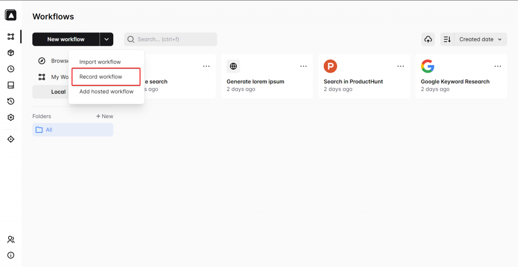Recording is the simplest way to create a workflow in “Automa”. First, click the “Automa” icon in the top right corner to open the “Automa” panel. Then, click the downward arrow icon on the workflow page and select the “Record Workflow” menu.