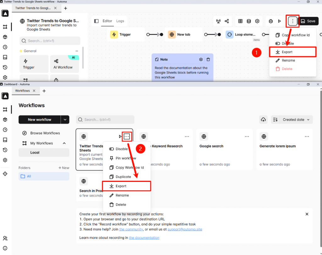 To stop recording, open the “Automa” pop-up window and click the ⏹️ button. To learn more about the recording workflow, you can watch the relevant video tutorials.