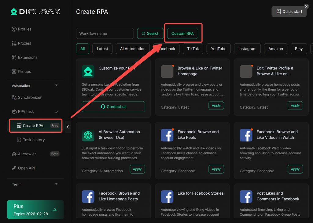You can enter the [Create RPA] interface, click [Custom RPA], and then you can enter the “Custom RPA Task” creation interface.