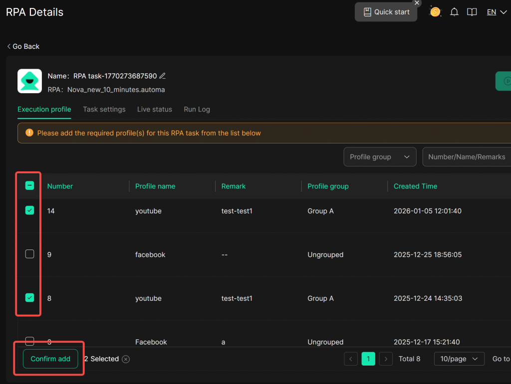 On the “RPA Details”, please first check the runtime profile required for the current RPA task, which can be single or multiple. After the selection is completed, click “Task Settings”.