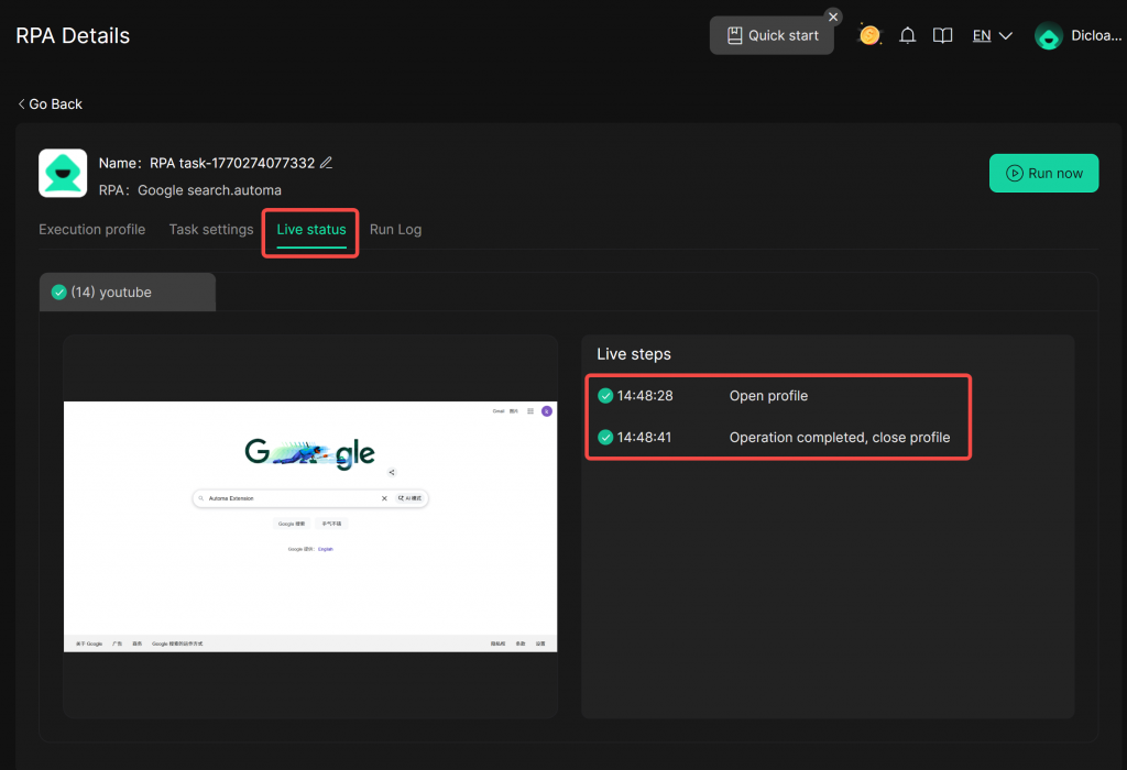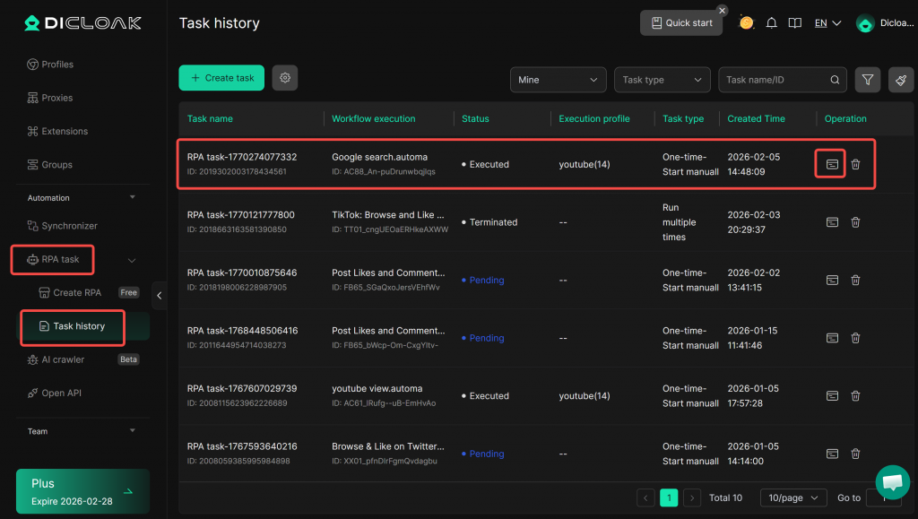 Additionally, you can view customized RPA tasks on the [Task history] interface.