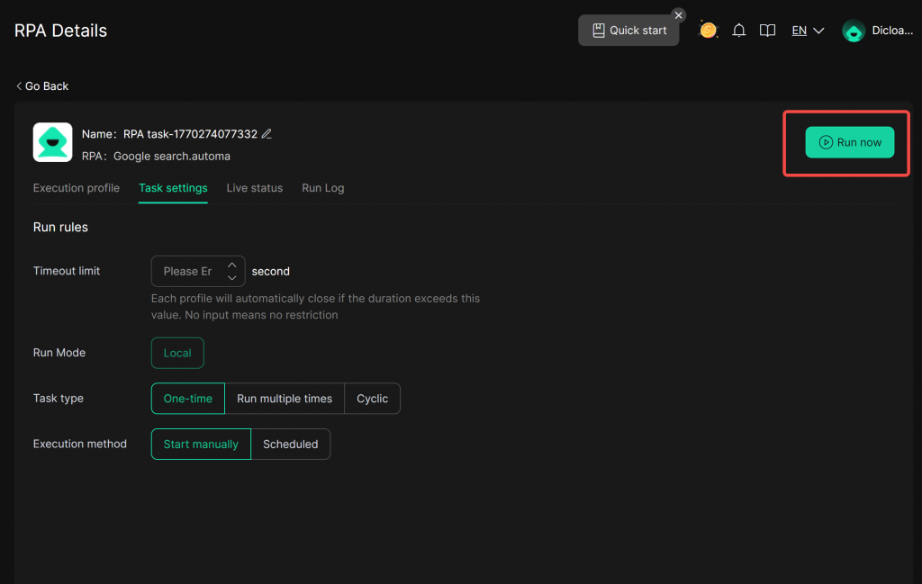 In the “Task Settings” module, you can edit the running rules of the current task. For the tutorial on using specific parameters, you can click to view . After completing the settings, click [Run Now].