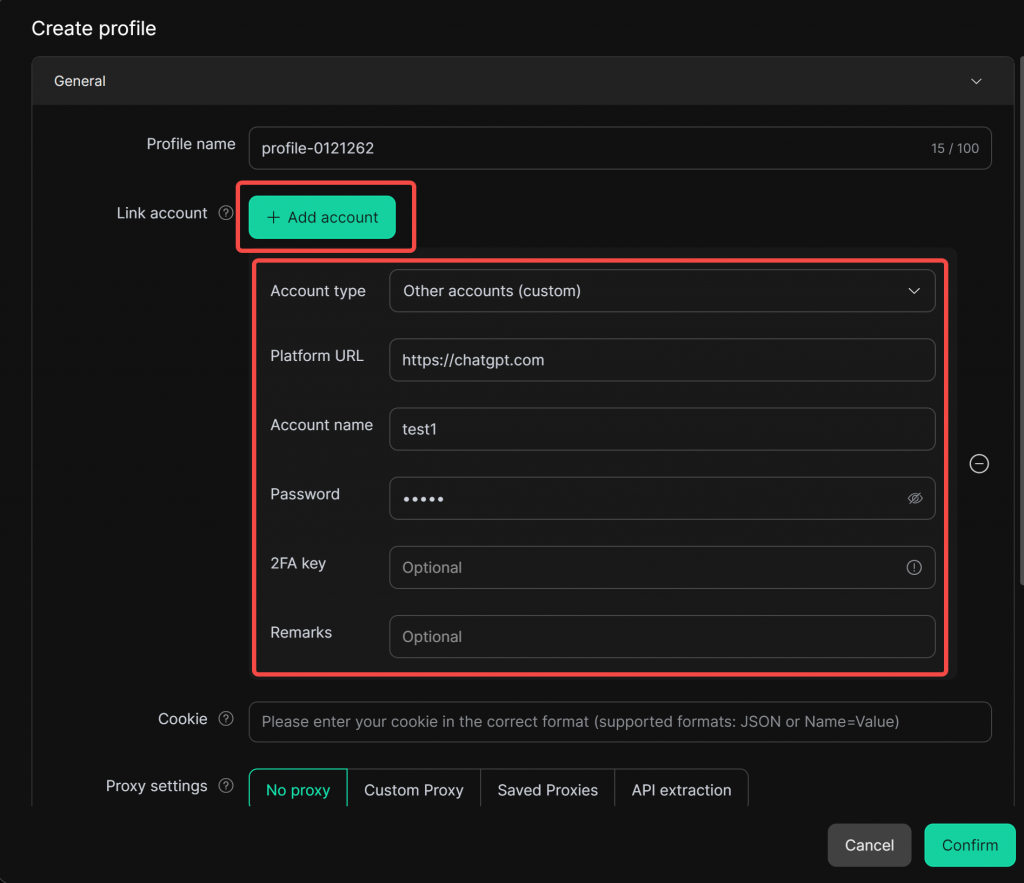- Platform Account: You can enter the shared account credentials (for example, for ChatGPT). Once the profile is opened, it allows quick login without requiring members to input the account details again.
