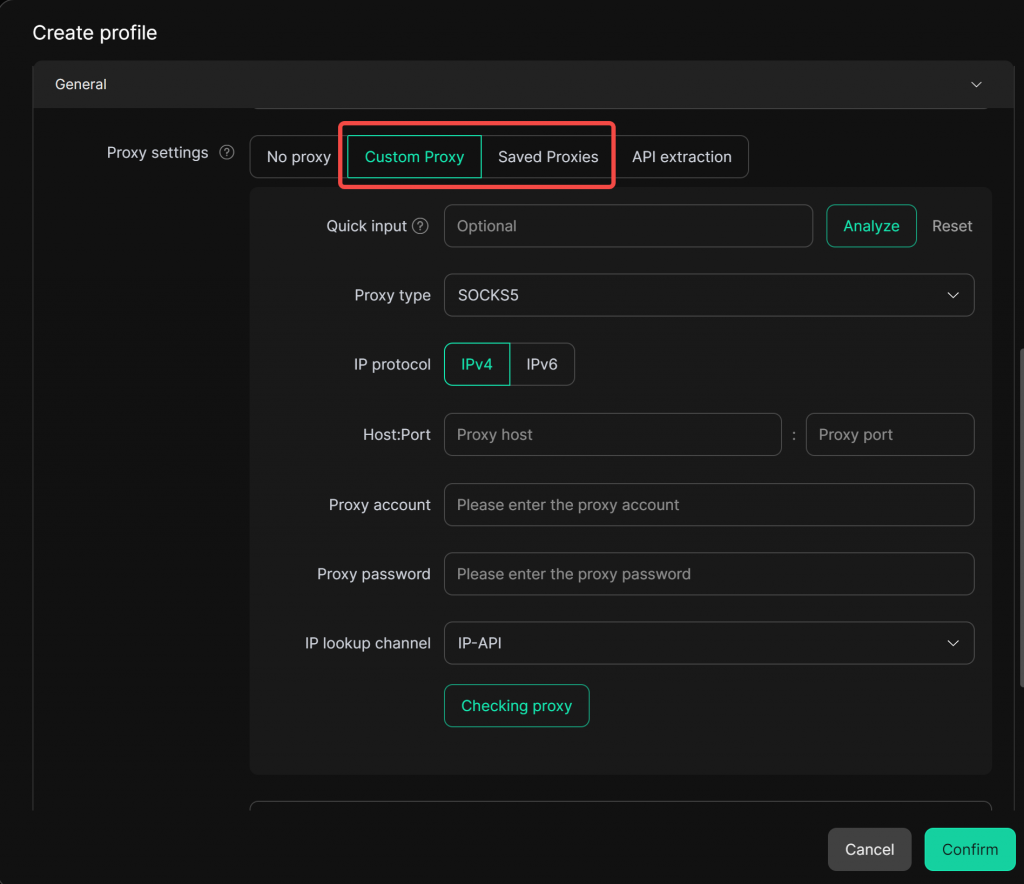 - Proxy Configuration: Since the shared account in the profile will be used by multiple members, it is recommended to configure a static proxy for the profile to ensure a unified external IP address. This can effectively prevent abnormal account usage detection caused by changes in device information and IP address when different members use the same account in different regions or network environments, thereby reducing the risk of account suspension.