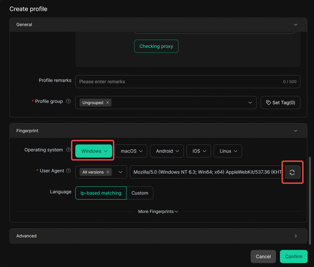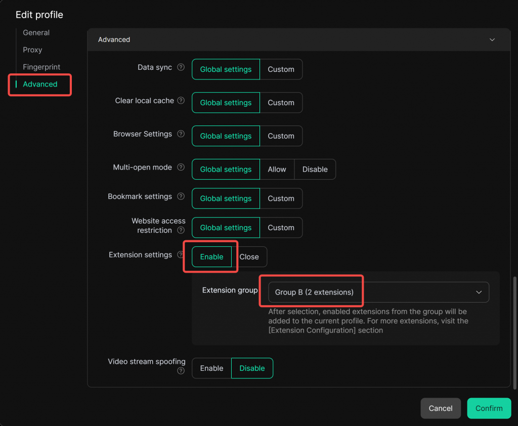 - After configuring, click Confirm, and then open the newly created browser profile.