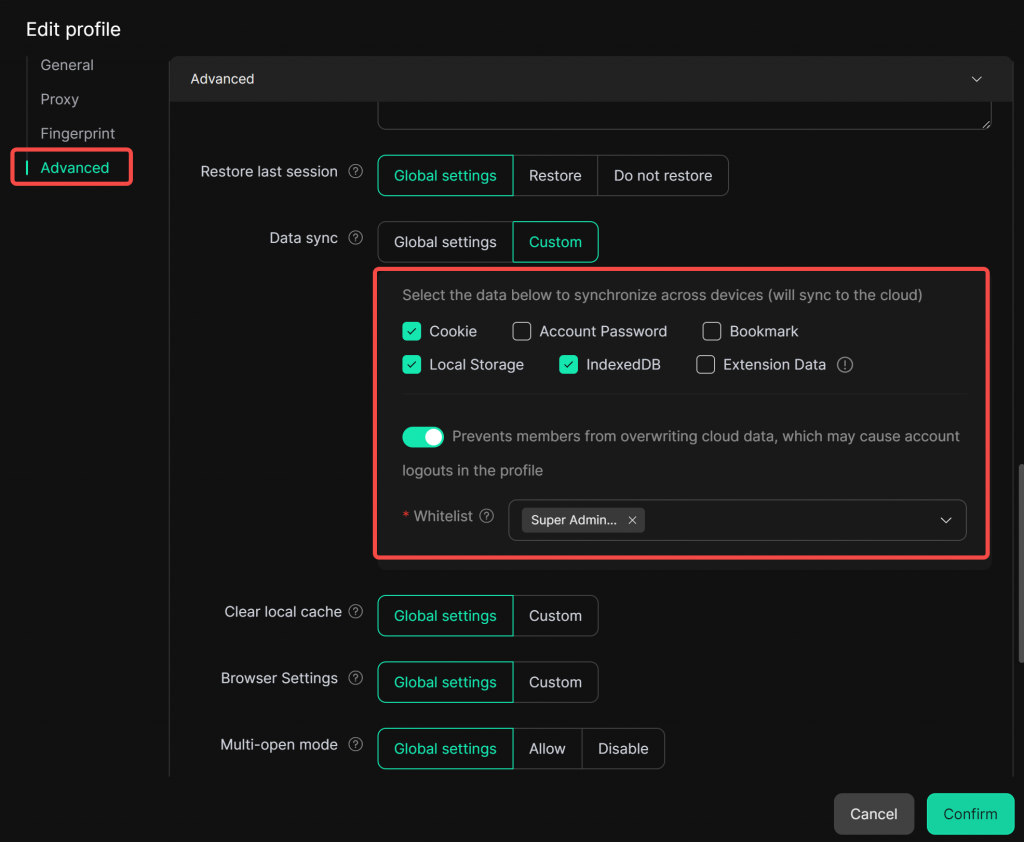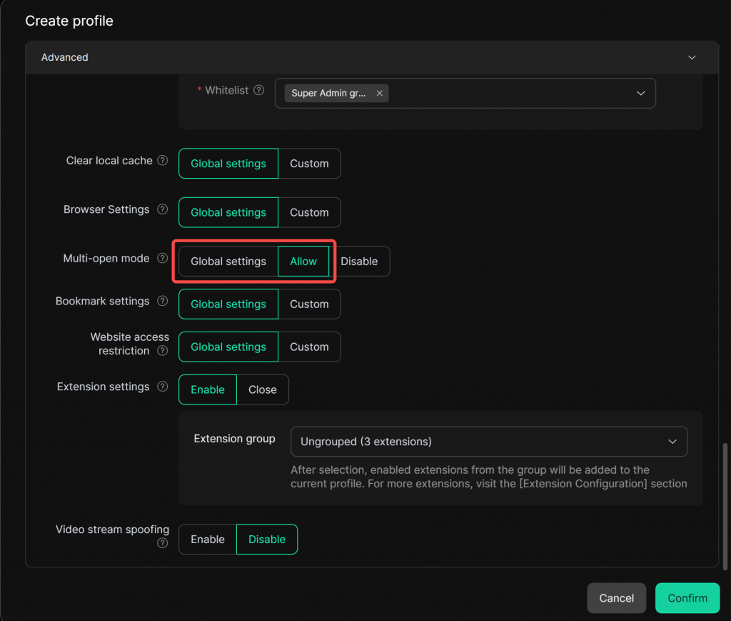 - Multi-open Mode: Select “Allow” to allow the profile to be used by multiple members simultaneously, enabling several people to share the same account in the profile.