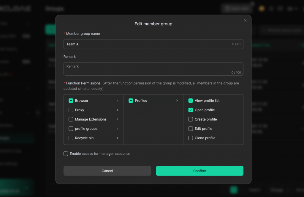 - Since members only need to use the browser profile and do not require other permissions, you can choose to only grant access to view profile list and to open profiles, while disabling other permissions. Then Click Confirm to complete the edits.
