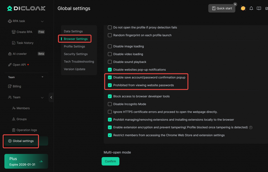 - In Global Settings, under the Browser Settings, check “Disable save account/password confirmation popup” and “Prohibited from viewing website passwords”(Available only on the Plus and Share+ plans).