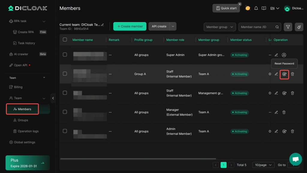 - In Members, when a member’s access expires, you can deactivate their account. If you need to assign that account to another user, simply reset the password.