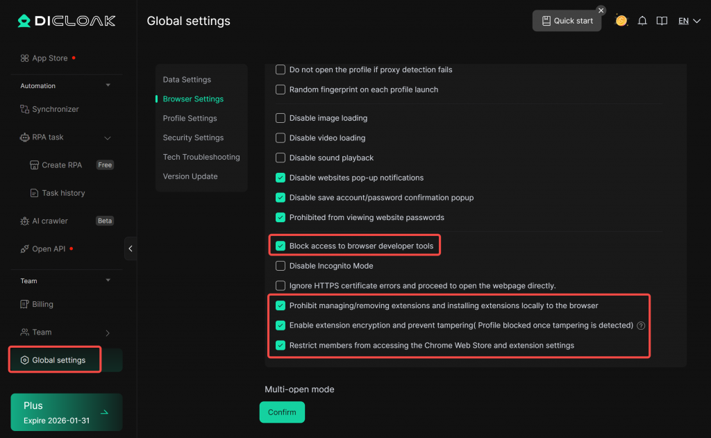 In the Global Settings, enable the extension-related disabling function in the Browser settings to prevent members from stealing account information through extensions.