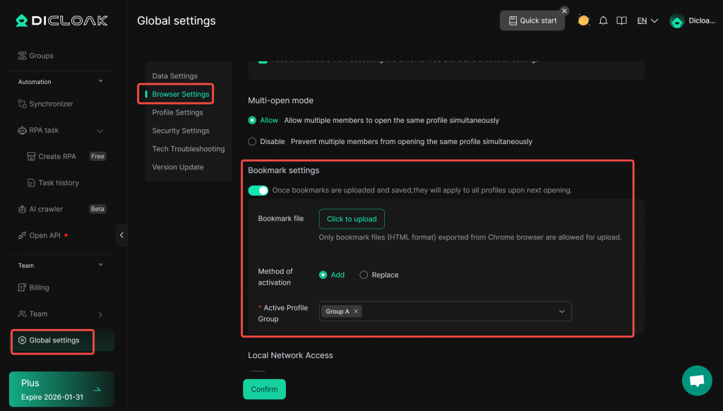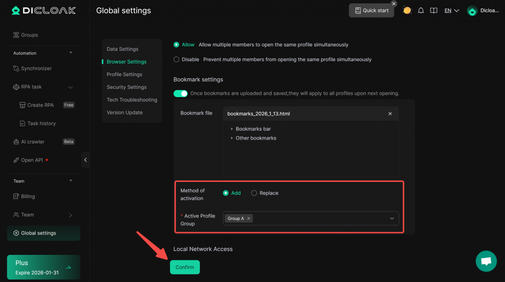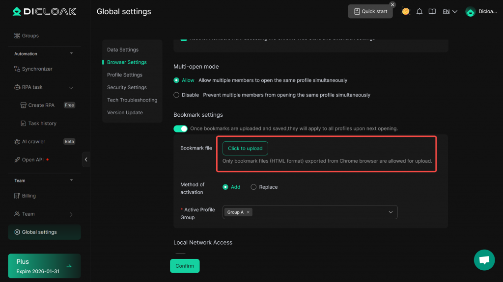 - Set the Active Profile Groups: The uploaded bookmarks will only take effect for profiles within the selected profile groups.