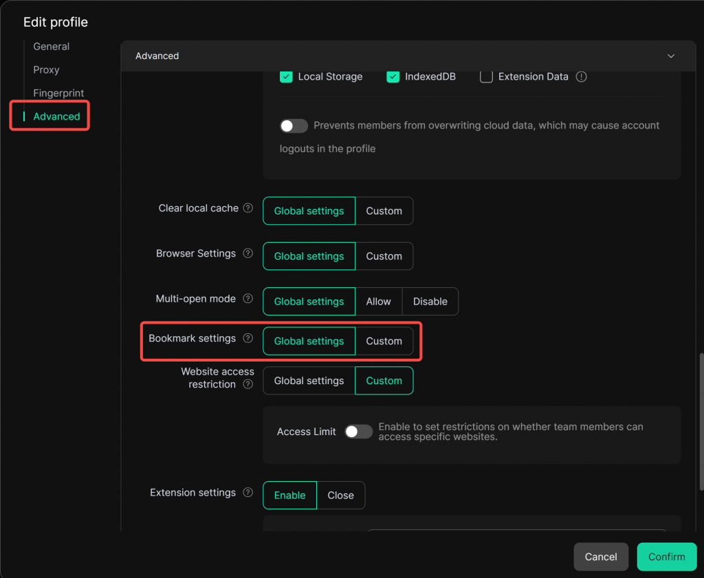 Under [Advanced], Set [Bookmark Settings] to “Global Settings” to apply the bookmark content configured in the [Global Settings] above. Alternatively, choose “Custom” to configure bookmark content individually for this profile.