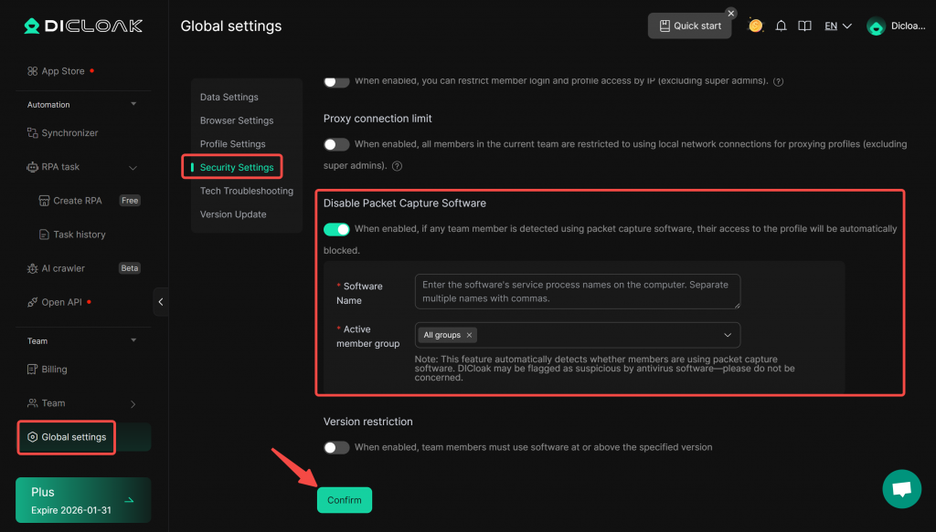 - Enter [Global Settings] interface. Under the [Security Settings], locate [Disable Packet Capture Software] module, and enable this feature.