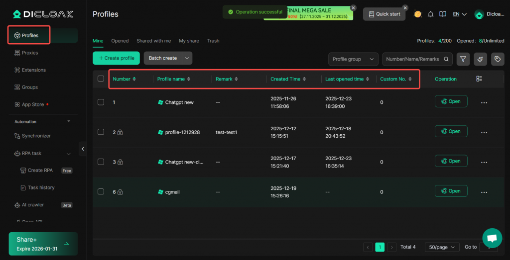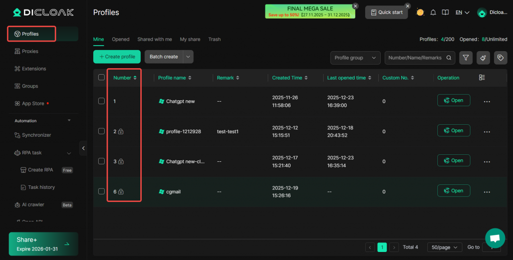 In the profile list, the system defaults to sorting by the profile number, which is generated based on the sequence in which profiles are created. If you wish to default to sorting by other fields or custom number, you can configure this through the Profile List Sorting settings.