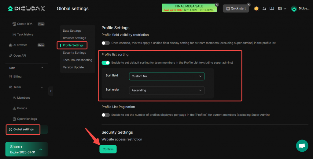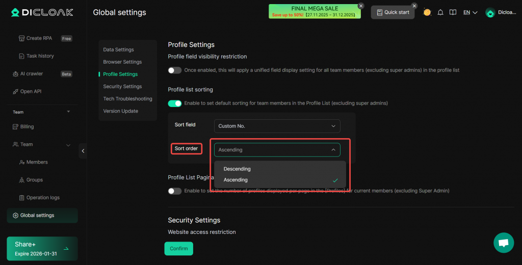 Once configured, when members access Profiles, the profiles will be displayed by default according to the specified Sort Field and Sort Order. This setting does not apply to the super administrator. The super administrator can directly click on any column header in profile list to sort in ascending or descending order.