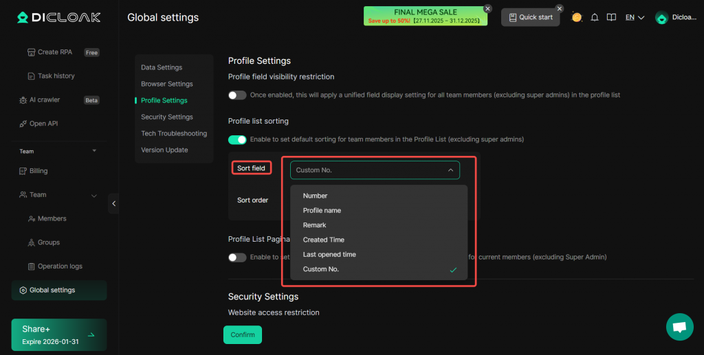 - Custom No.: Assign a custom number to each profile and sort based on this number.