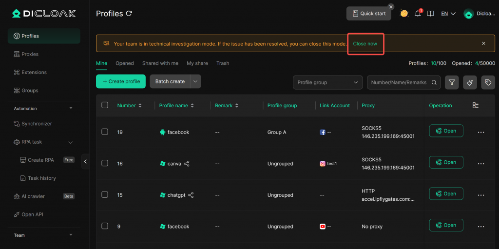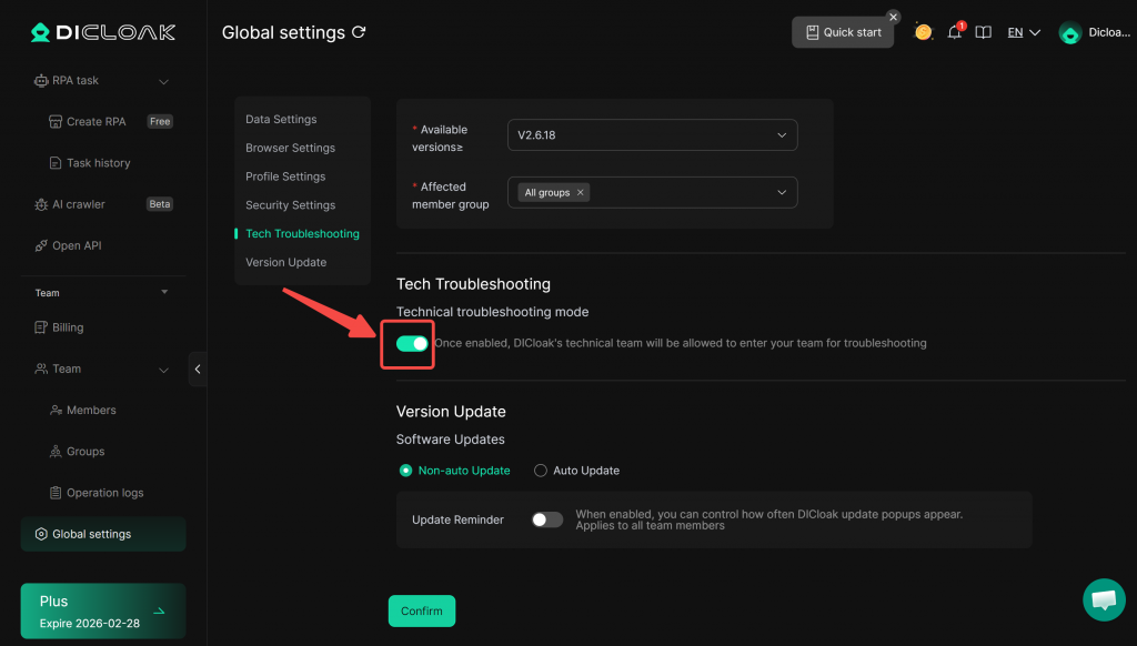 Once troubleshooting mode is enabled, DICloak’s technical team will be allowed to access your team for troubleshooting.