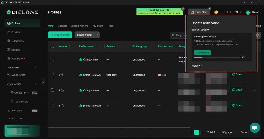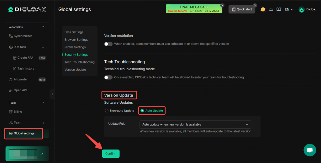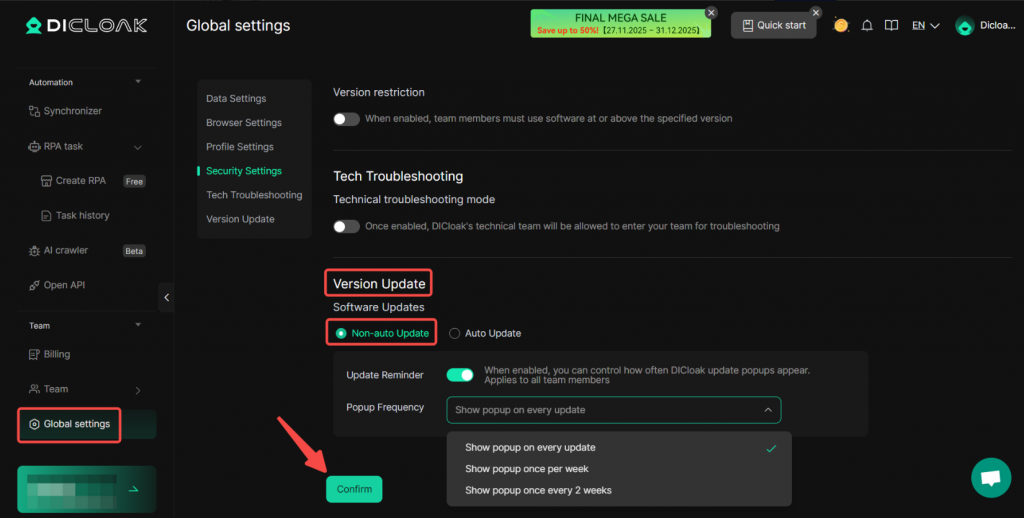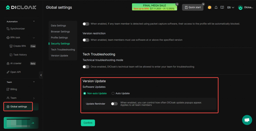 - Update Reminder: When enabled, all members will receive a notification when a new version of DICloak is released.