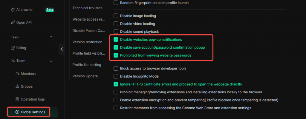 - Go to [Global Settings], turn on the function of prohibiting viewing passwords and prohibiting pop-up windows for saving passwords·