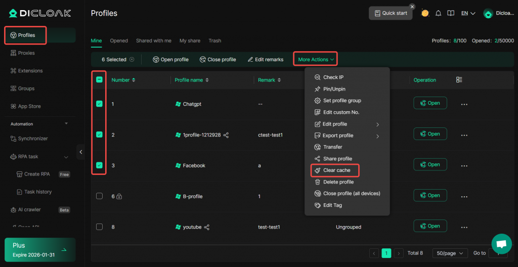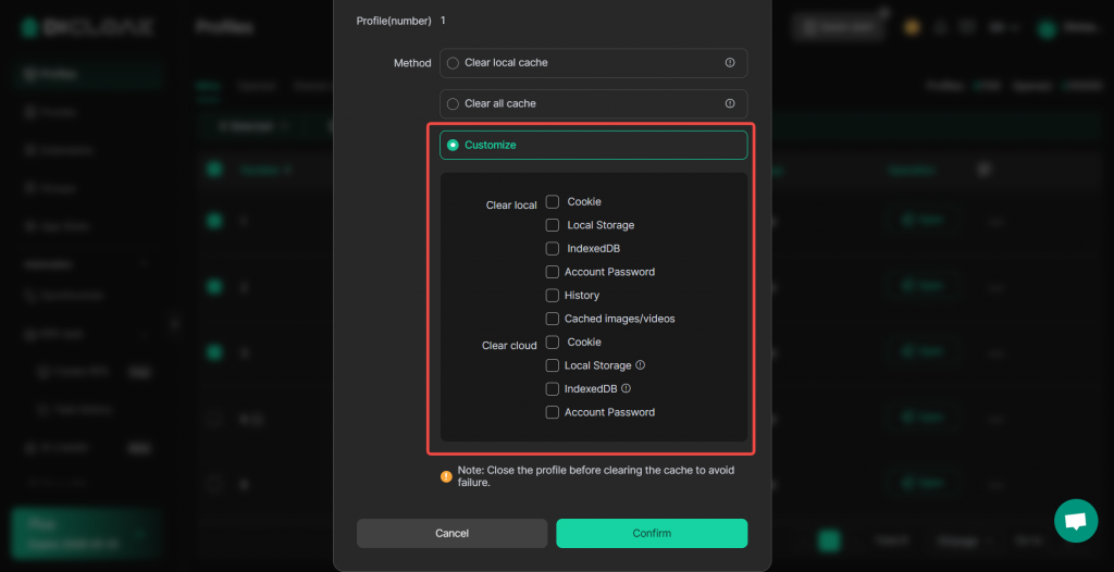 DICloak supports clearing the cache of browser profiles. You can follow the steps below to clear the cache of a specific profile.