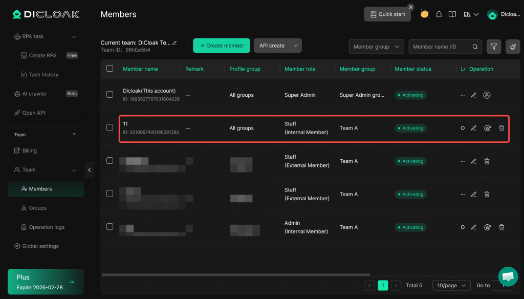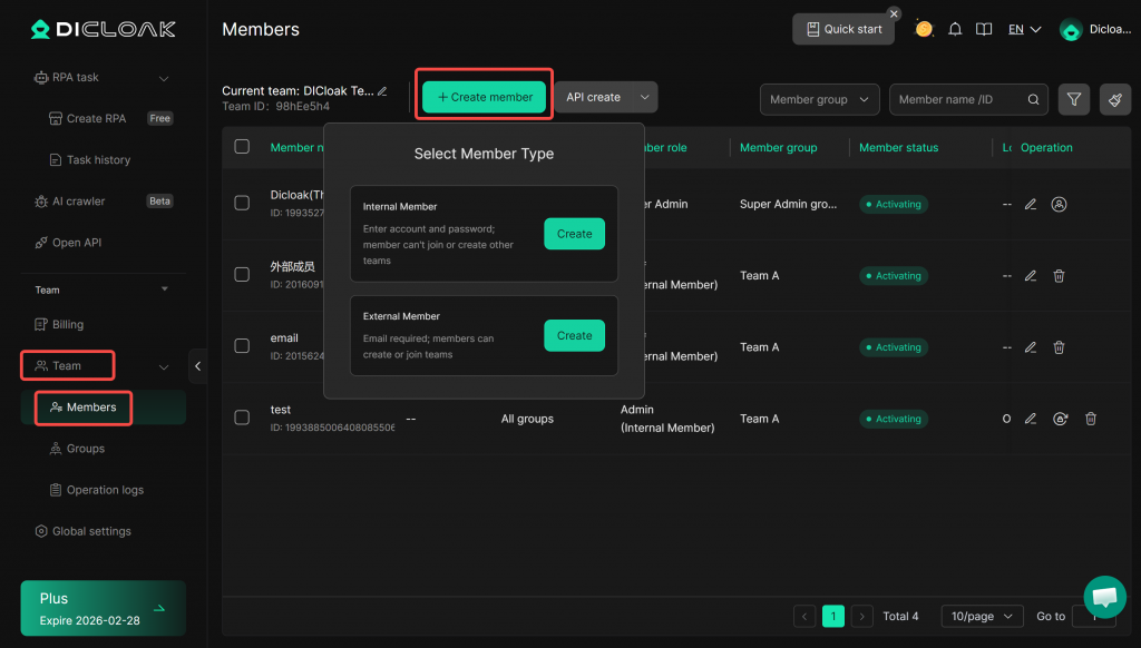 DICloak allows you to add new members to your team, assign them a team role, and configure their profile group permissions. Member types are divided into Internal Members and External Members. Internal members cannot create or join other teams, making account management easier. External members can create or join other teams, facilitating collaboration. If you want to add a new team member, follow the steps below.