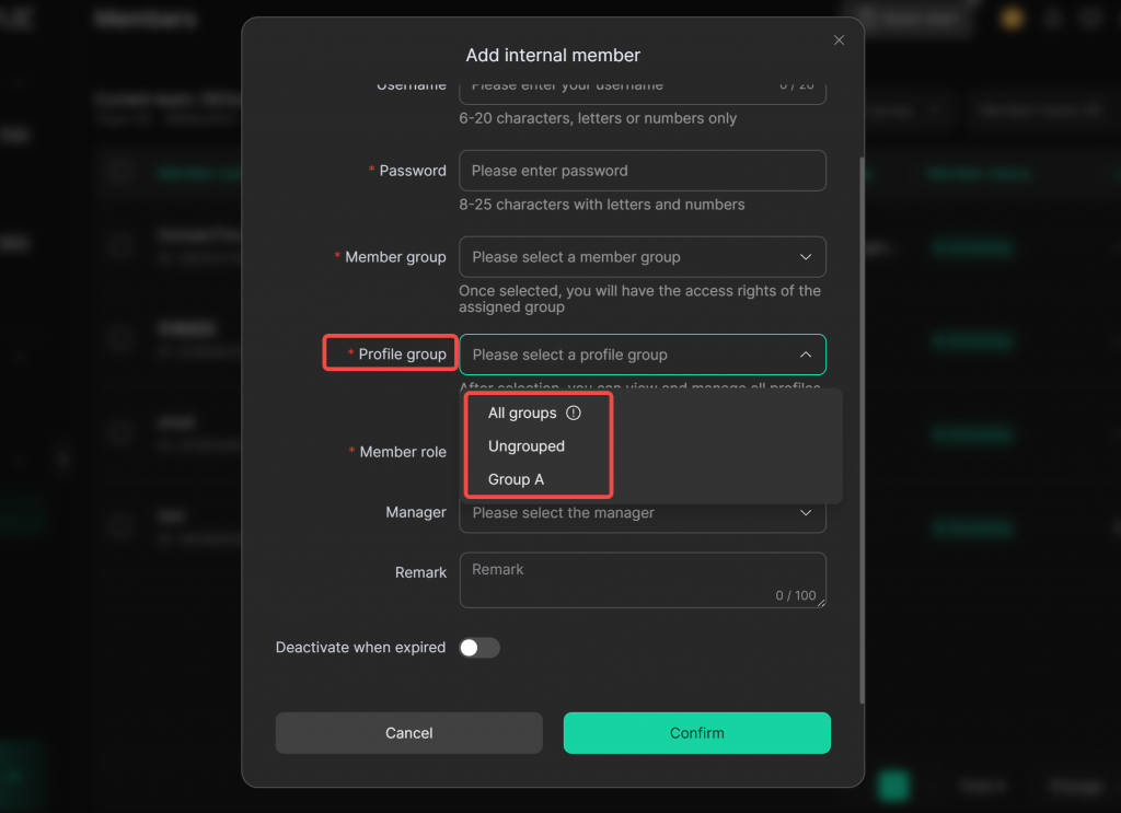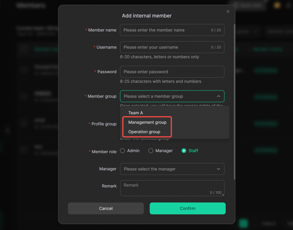 Select the relevant Member Group for the member. You can choose the default groups [Management Group] or [Operation Group], or create a new member group in [Team] > [Groups] and then select it.