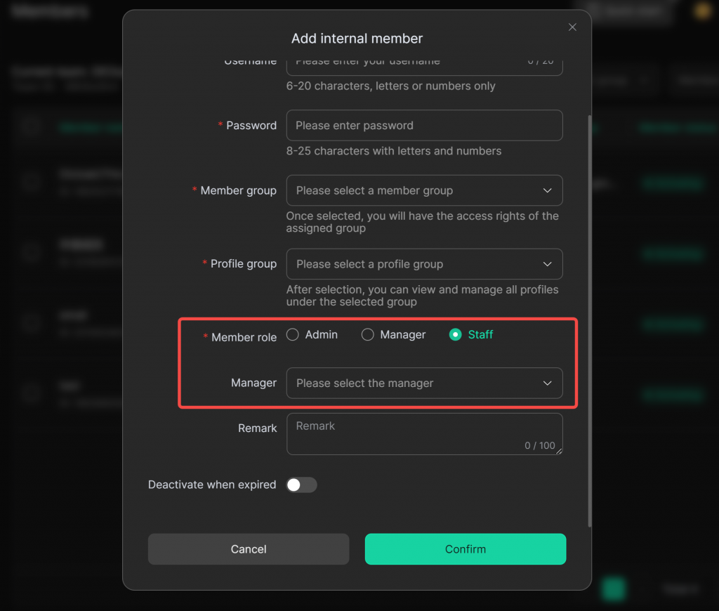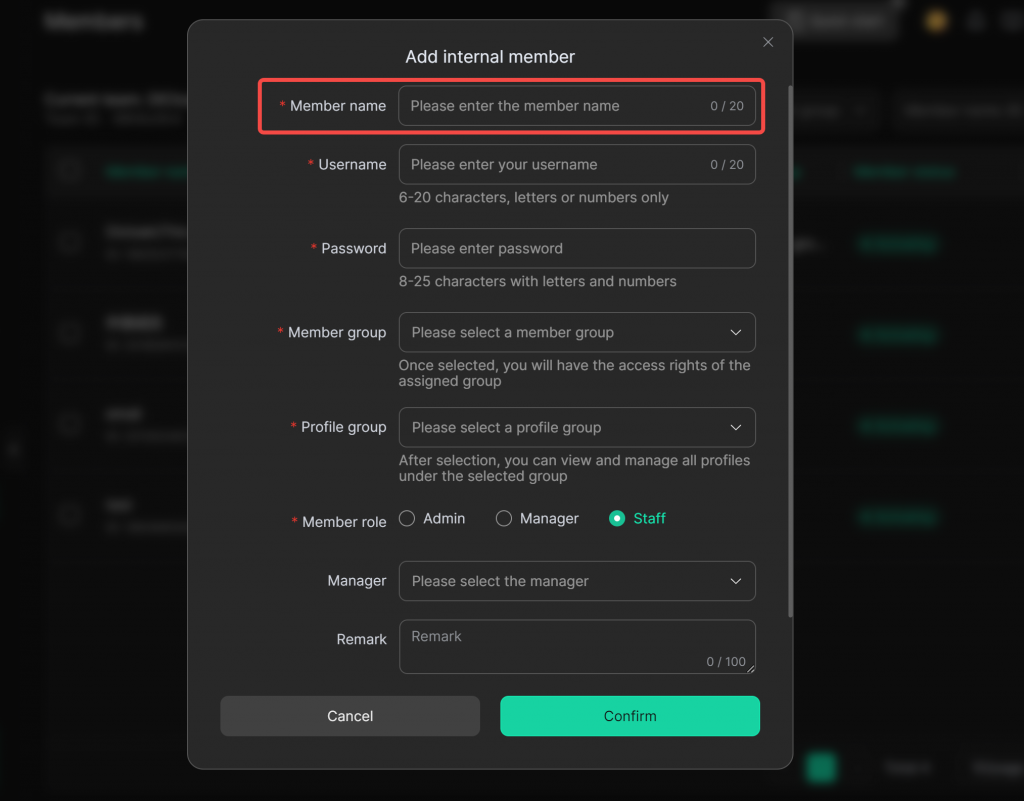 Remark (optional): Add more detailed information about the member for easier management.