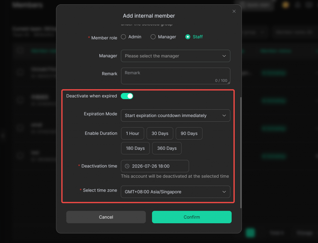You may choose to enable the expiration deactivation feature, set the deactivation time and time zone. Upon reaching the deactivation time, the member account will be automatically disabled and unable to log in.