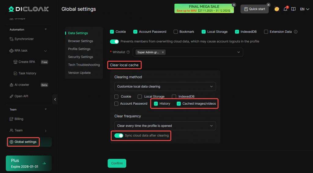 Go to “Global Settings” and configure the “Clear Local Cache” section, check the “History” and “Cached images/videos” option. Once enabled, each time a member opens a profile, the local browsing history and cached images/videos on the device will be automatically cleared.