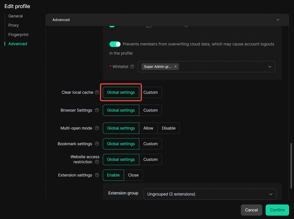 Then, in “Profile”, edit the profile and set the “Clear Local Cache” option to “Global Settings”.