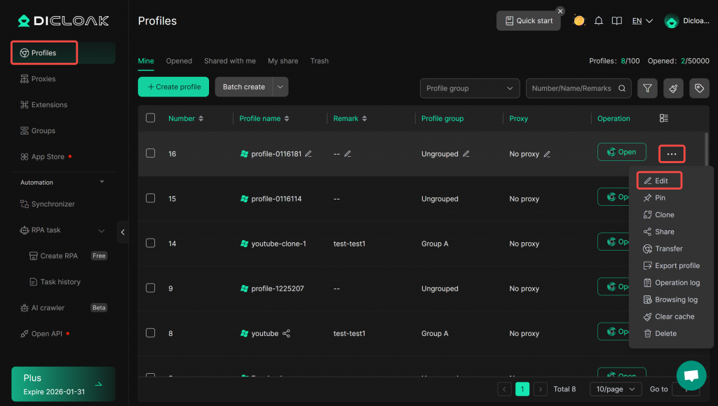 - Go to the Profiles, locate the profile you want to modify, and click “Edit”.