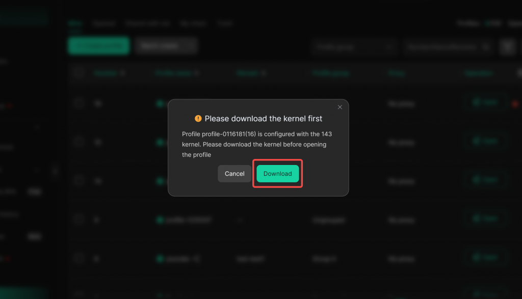 4. After the kernel is changed, if a member’s device does not have this kernel downloaded, a “Download Kernel” pop-up will appear when they open the profile. Please click “Download” and wait patiently for the download to complete before opening and using the profile.